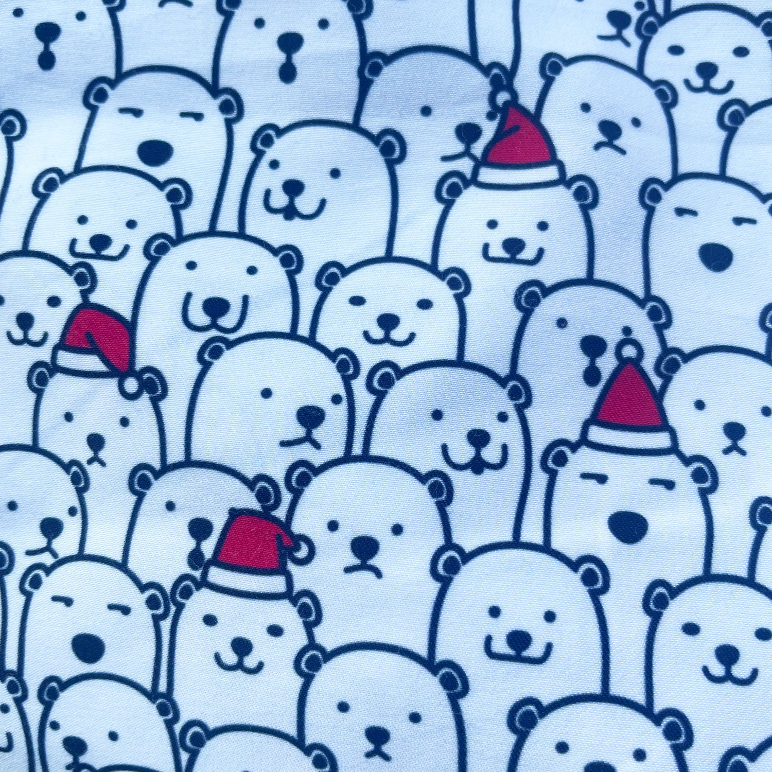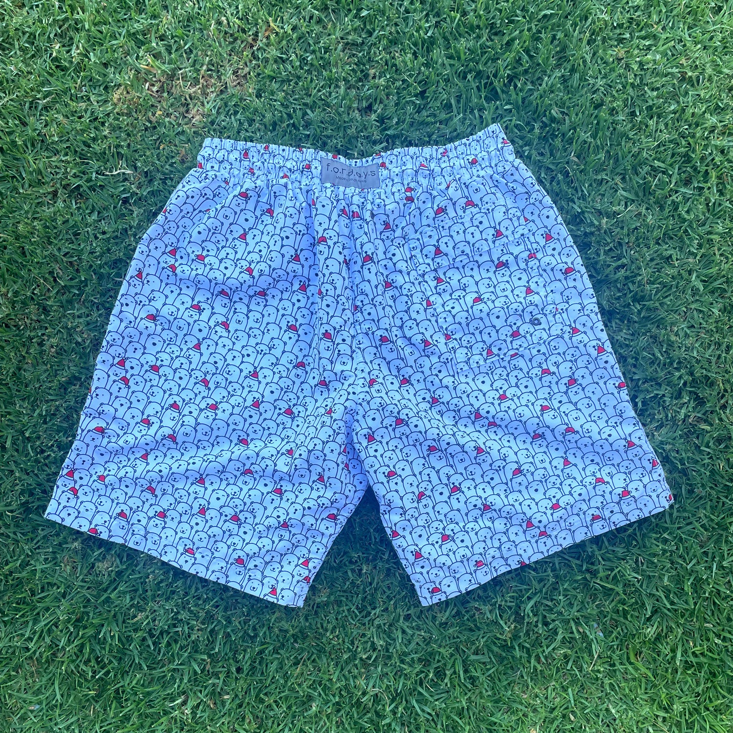 These playful shorts feature a joyful crowd of cartoon polar bears—some sporting adorable red-and-white Santa hats—set against a crisp white backdrop with bold black outlines. Designed for comfort and everyday adventure, they include handy side pockets, a secure velcro back pocket, and a drawstring elasticated waist for the perfect fit.