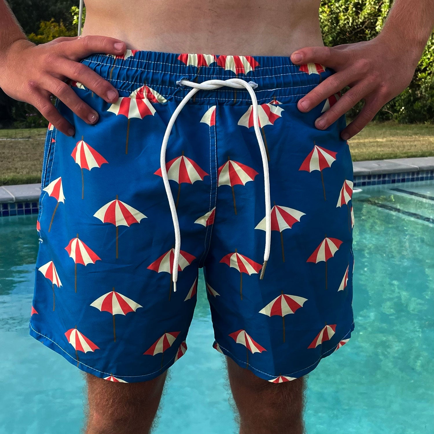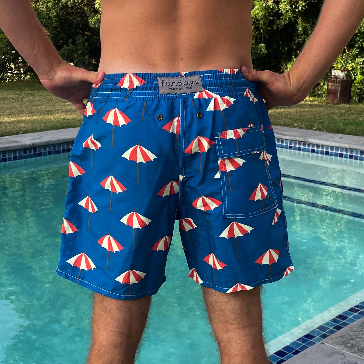 Bring instant holiday energy to every summer adventure with these ForDays Boardshorts in a cool ocean-blue, splashed with playful red and white beach umbrellas. These shorts are all about sunshine vibes — bold, bright, and made for beach days that turn into braai nights.