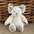 Details: Soft white fur with floral fabric paws, inner ears and matching head bow