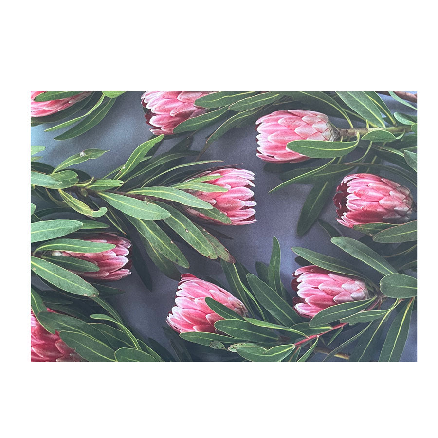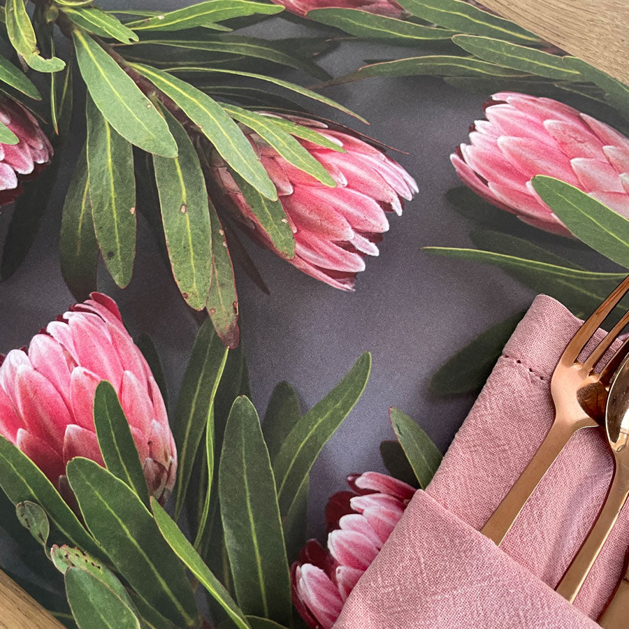 We love how these proteas POP on the dark charcoal background - these disposable placemats will add a feeling of elegance with a floral flair to your table setting. Perfect for summer or winter styles with the contrasting colours that can be elevated with either dark wintery vibes or bright summery splashes of pink.