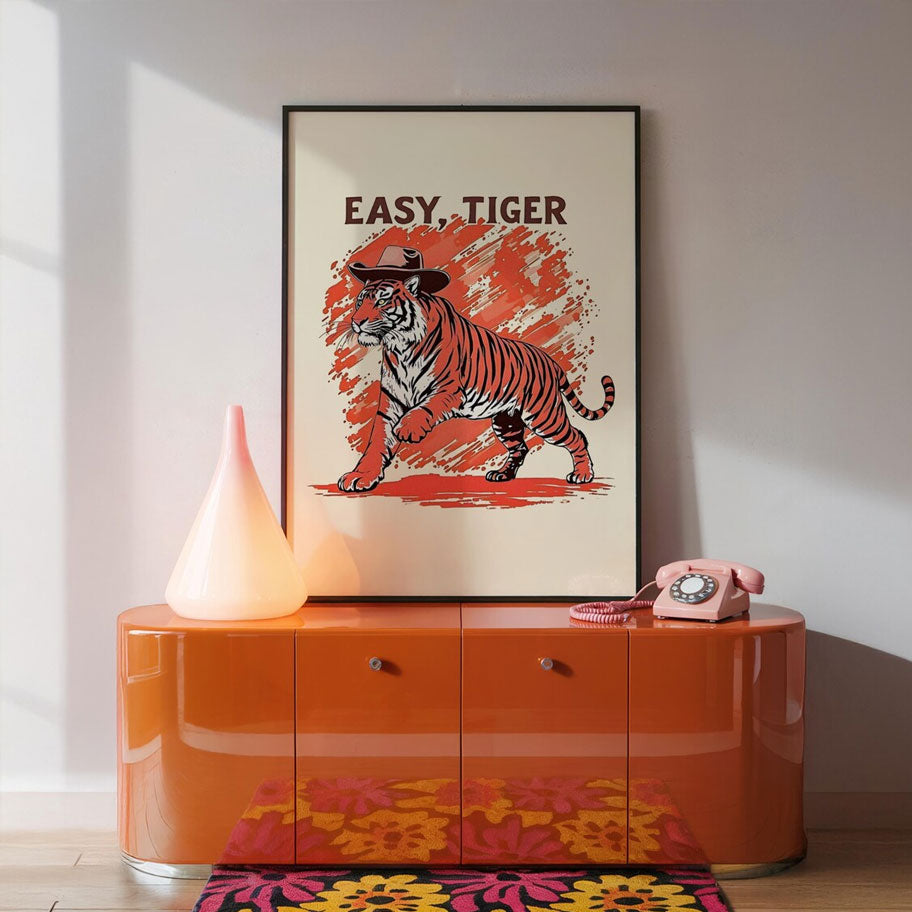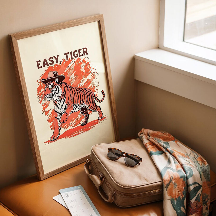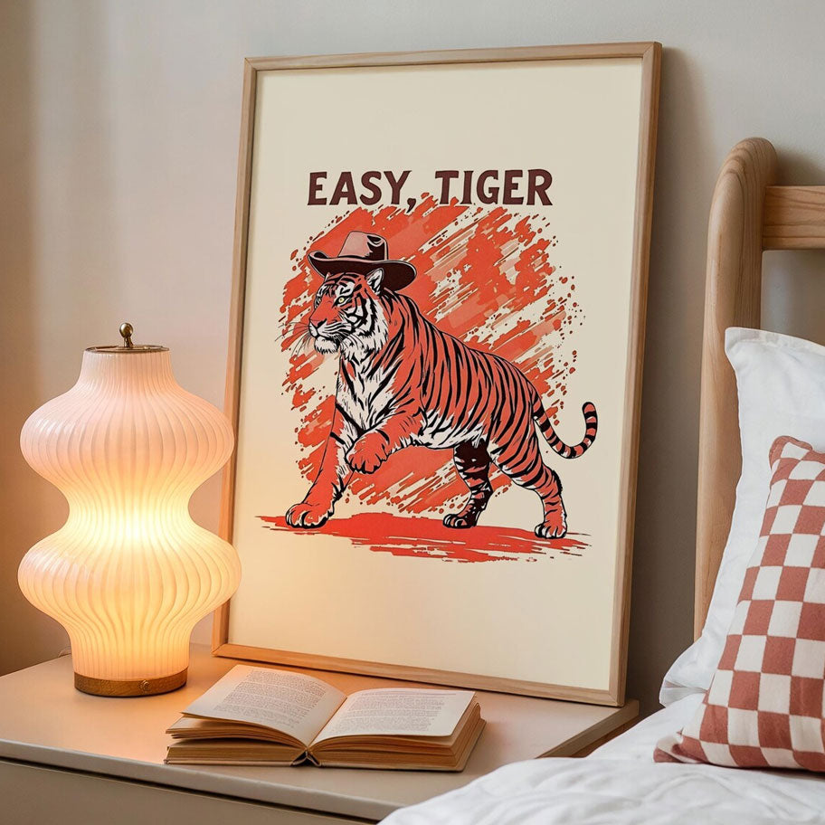 This “Easy, Tiger” print is a bold, vintage-inspired statement piece — featuring a confident tiger in a cowboy hat, stepping forward with western swagger against a retro brush-stroke backdrop. It’s quirky, graphic, a little cheeky, and designed in that trending modern-retro illustration style everyone is obsessed with right now.