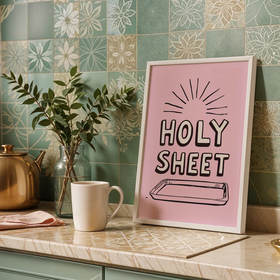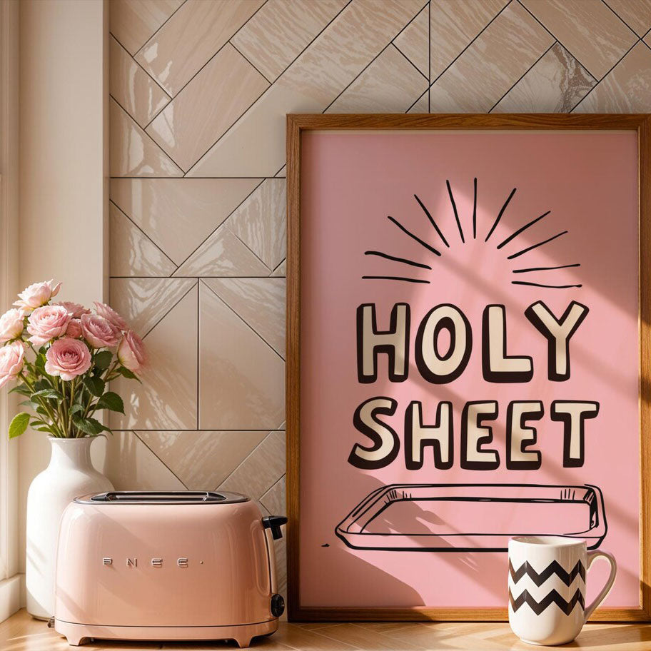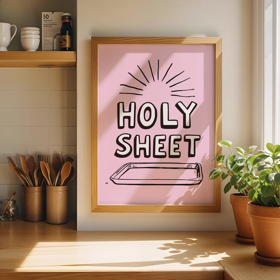 This cheeky printable wall art features the phrase “Holy Sheet” — a clever nod to every baker’s favourite tray and sense of humour. With bold hand-drawn lettering, simple line art, and a playful pink background, this design brings personality and a touch of spiritual sass to your kitchen, coffee nook, or bakery wall.