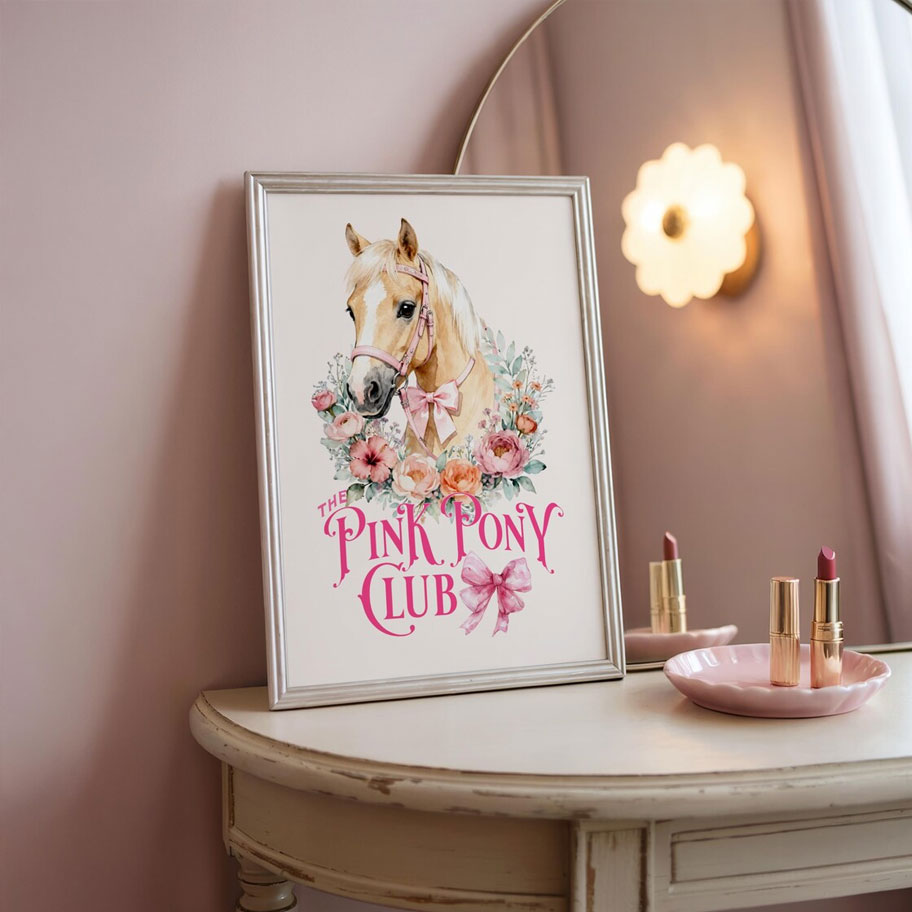 This “Pink Pony Club” print features a soft watercolor pony with a pastel pink halter and bow, surrounded by a lush floral arrangement of blush blooms and sage greenery. It’s sweet, whimsical, and perfect for pony lovers of all ages — especially little ones who live for horses, pink things, and pretty room decor.