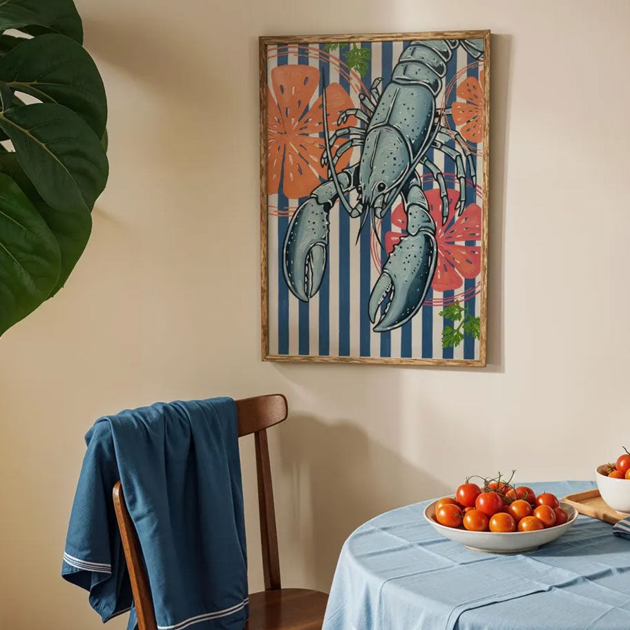 Inspired by vintage kitchen posters, this hand-painted style artwork features a striking lobster illustration against a striped backdrop, accented with citrus and herb motifs.