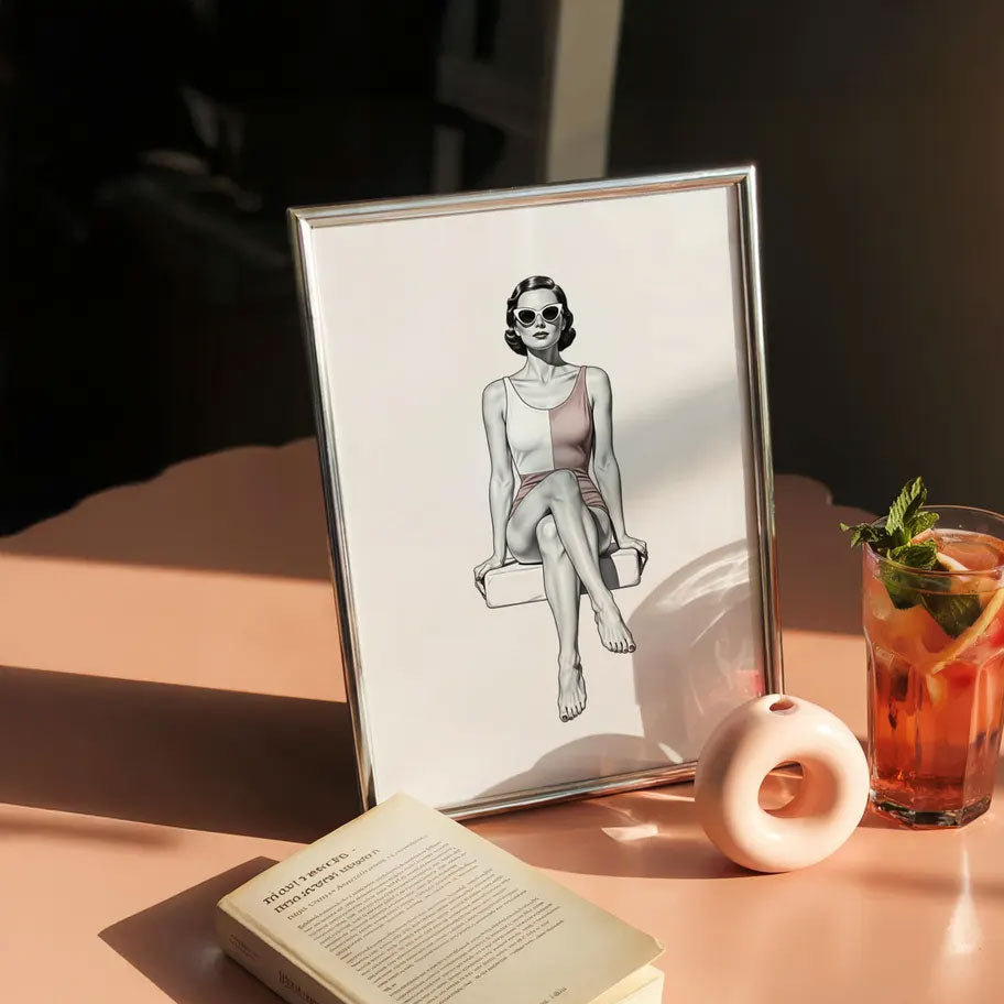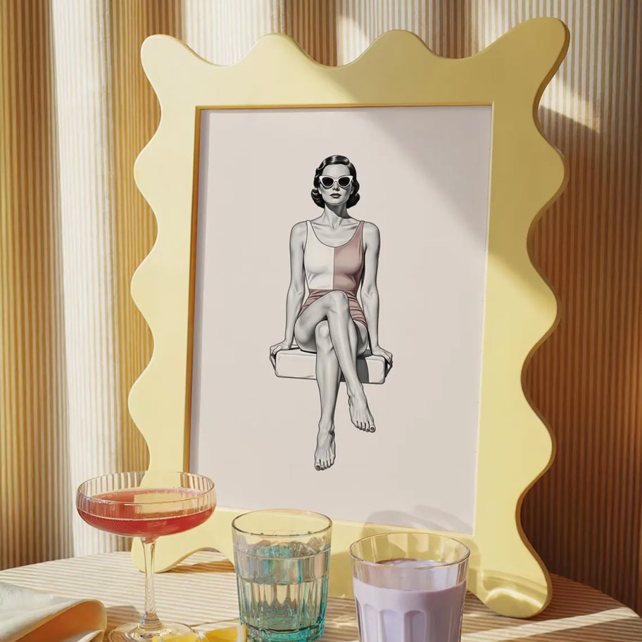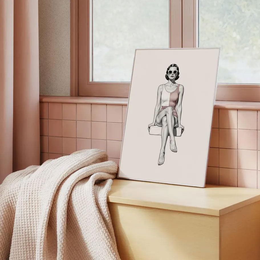 This chic “Retro Poolside Girl” print brings mid-century elegance to modern spaces. Clean lines, soft tones, and that classic cat-eye cool make it perfect for bathrooms, poolside lounges, dressing rooms, and airy feminine interiors. It adds effortless style, vintage charm, and that soft summer energy all year round.