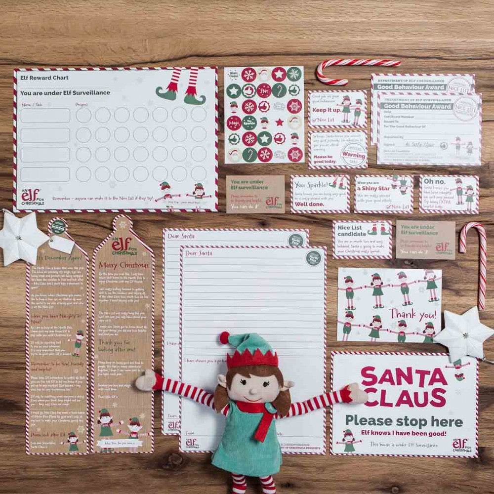 Designed for families with up to two siblings, all of the items in our kit can be shared & we have included letters to/from Santa, Nice List Certificates, mini elf report cards, a reward chart and stickers, “Elf is Here” posters, a departure letter from Elf and a “thank you for having me” postcard to send after Elf has returned to the North Pole.